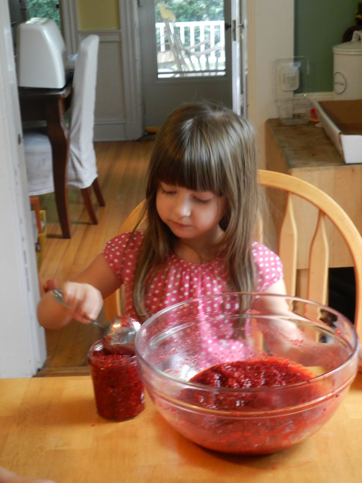 Our favorite farm to go berry picking at sent an email out saying that they had reduced the price of their pick your own raspberries in the hopes that people would come and pick them before the hurricane came up our way and potentially damaged the plants. The girls and I decided to go and "save the raspberries". After all, at $3.00 a pound you can't go wrong! We would have stayed longer and picked even more, but poor Grace ended up getting her first bee sting while we were there. We took that as a sign to gather our things and head home. We decided to use the freezer jam recipe from Pomona's Universal Pectin (along with honey as the sweetner) for these berries. The entire time we were making the jam, Grace kept saying: "Mama, this is going to be the best jam ever!" Somehow, I think she may be right!