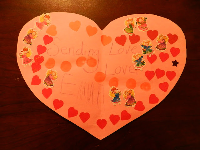 Once everything was shared and we'd gotten our day started, I gathered the necessary supplies and we got to work. The girls know nothing of the events on Friday. They simply know that something happened that made their mama very sad. When we sat down to begin this project they were very surprised to see hearts. "Valentine's!" they exclaimed and I replied "Well, sort of. There is a town not too far from Gramma and Grandpa that is in need of some cheering up right now, so I thought it would be fun if we decorated these hearts and sent them their way." The girls agreed and quickly got to work. You could have heard a pin drop, everyone was so focused. Lots of love was poured into the creation of each heart.